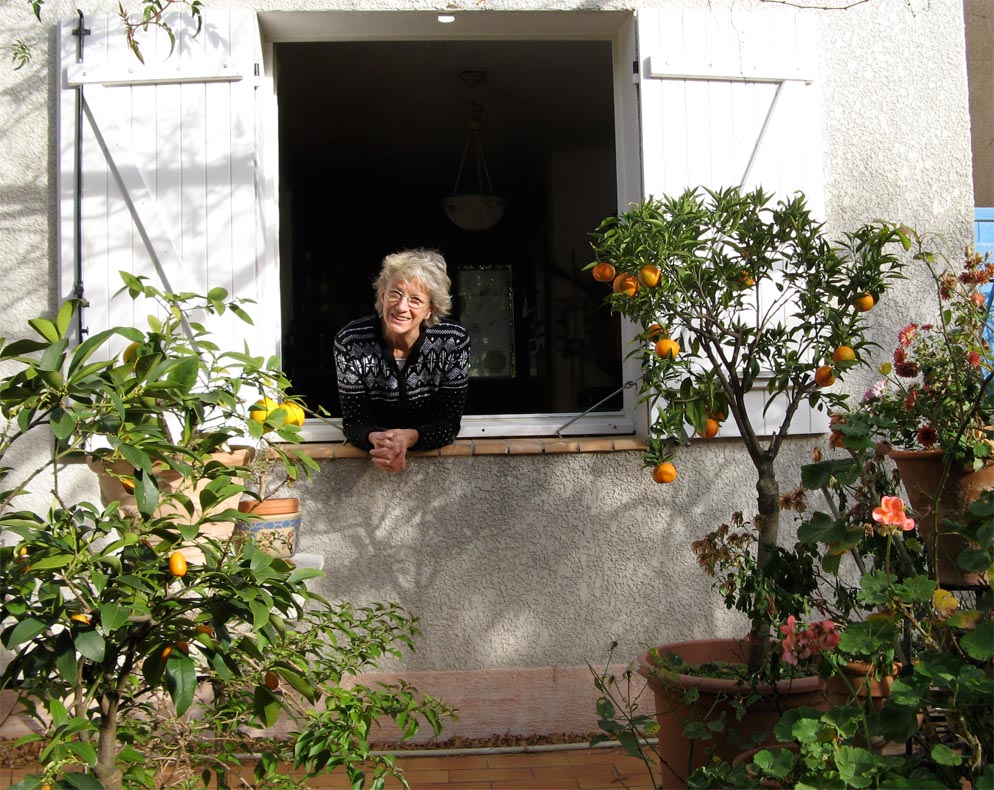 Tuesday 08. 12. 09 It has been a busy week getting ready to leave for Toronto. I’m still working on my large landscape and have been also working on a big drawing of Liverpool Street station. Went to my etching class last friday instead of this monday as I had a book club meeting yesterday. A very festive meeting complete with mulled wine, mince pies and Christmas cake. Today I was in Montpellier finishng up some Christmas shopping and I also dropped in on Claire. It was a beautiful sunny day and above is a photo I took of Claire between her orange tree and her lemon tree. Not bad for December!